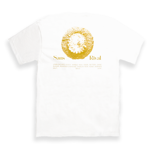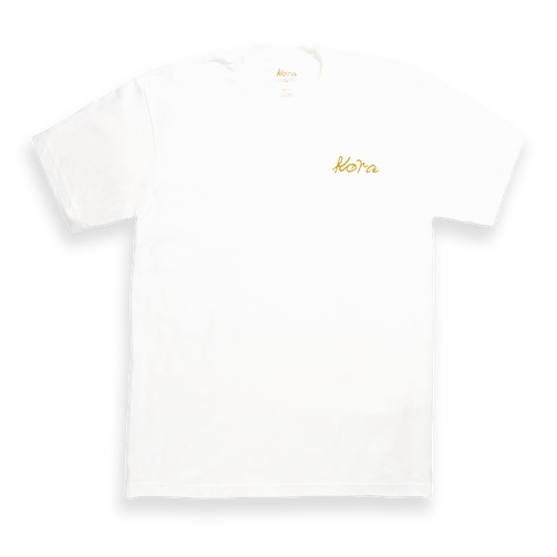 100% cotton seamless white tee with Kora's signature Sans Rival doughnut screen printed on the back and the Kora logo on left chest. All merch is final sale.